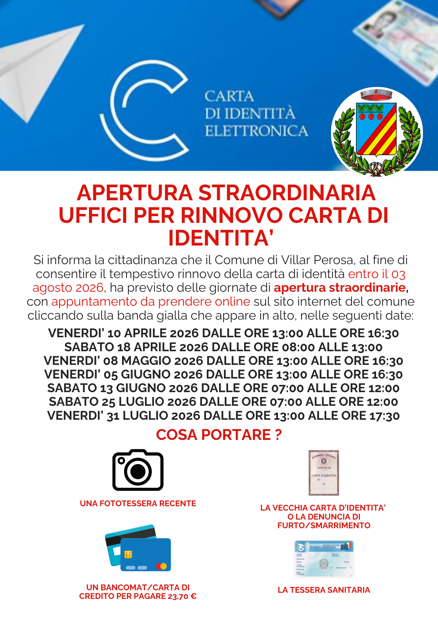 Si informa la cittadinanza che il Comune di Villar Perosa, al fine di consentire il tempestivo rinnovo del documento entro il 03 agosto 2026, ha previsto delle giornate di apertura straordinarie, con appuntamento da prendere online, come da locandina allegata