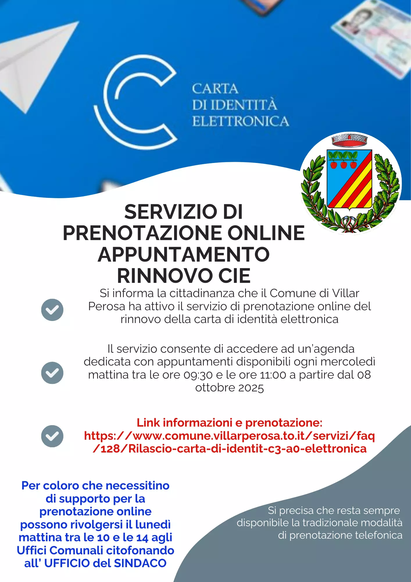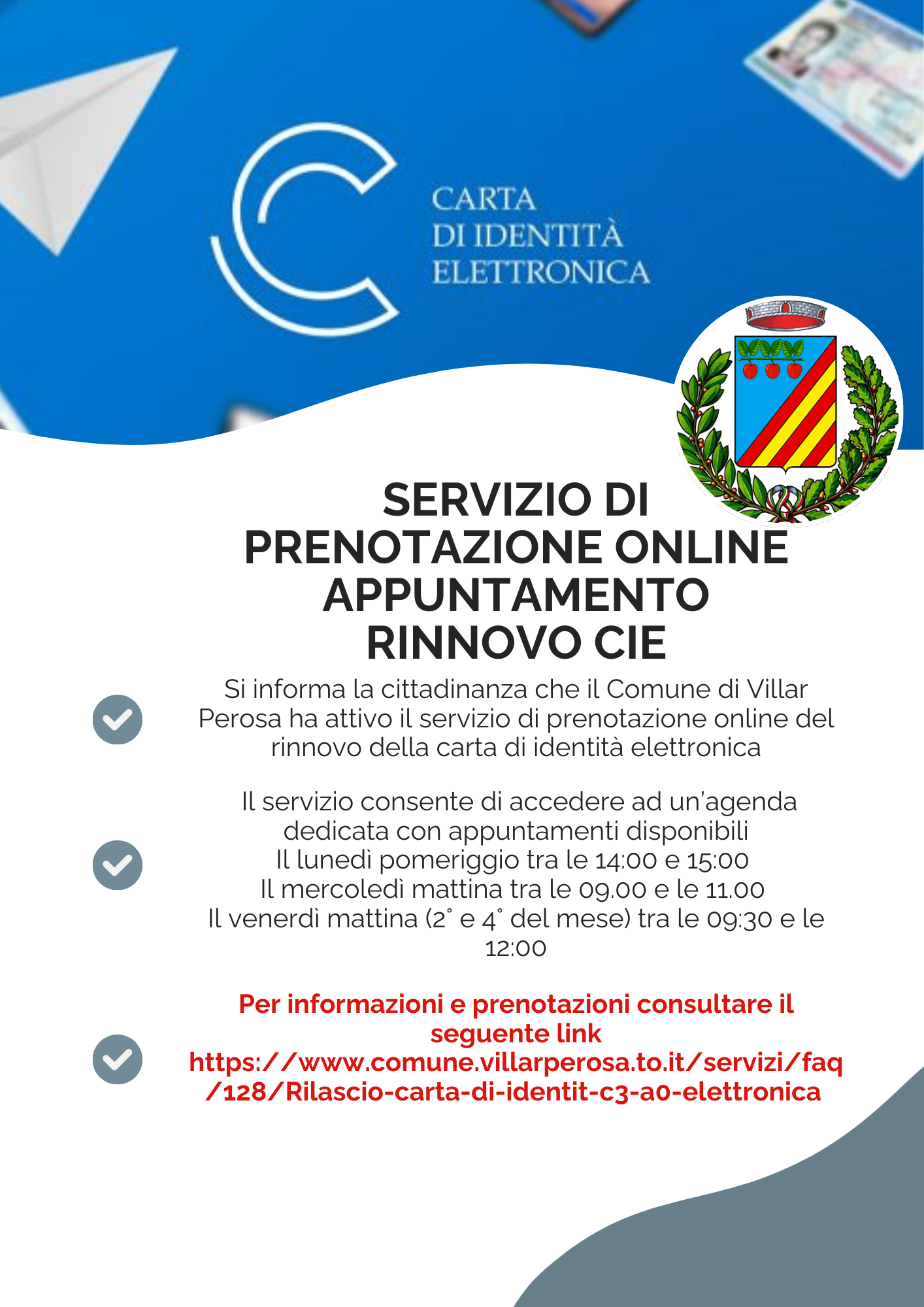 Si informa la popolazione che il Comune di Villar Perosa ha provveduto ad attivare il nuovo servizio di prenotazione online per il rinnovo della Carta di Identità Elettronica.
